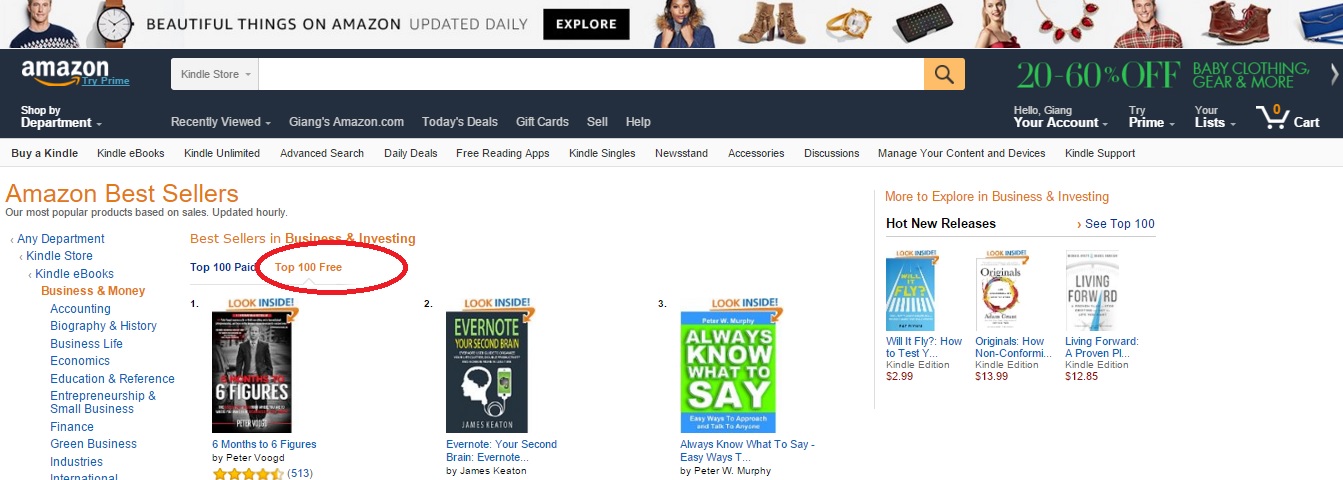 Bạn có thể tìm trong TOP 100 FREE nói chung thuộc mọi thể loại (click vào đây); hoặc có thể lọc dòng sách yêu thích của mình (Novel, Self-help, politics …) bên góc trái sau đó click vào TOP 100 FREE như hình minh hoạ dưới đây;